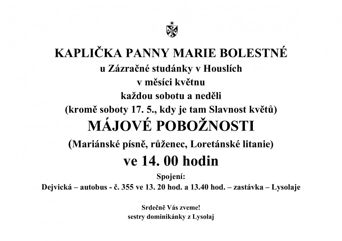 Májové pobožnosti u kapličky v Lysolajích U kapličky Panny Marie Bolestné u zázračné studánky v Houslích (Lysolajích) se v měsíci květnu každou sobotu a neděli (kromě soboty 17. 5., kdy je tam Slavnost květů) konají ve 14:00 MÁJOVÉ POBOŽNOSTI. (Mariánské písně, růženec, Loretánské litanie).