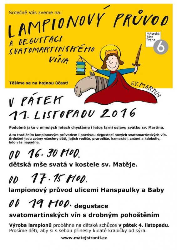 Svatomartinský večer letos připadá na pátek 11. listopadu a začneme jej od 16:30 dětskou mší svatou v kostele sv. Matěje. Poté vyrazíme na lampionový průvod ulicemi Hanspaulky a Baby a akci zakončíme na faře cca od 19:00 degustací svatomartinských vín a drobným pohoštěním.