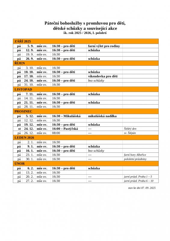 Aktualizovaný harmonogram pátečních dětských mší svatých a navazujícího programu pro děti na faře.